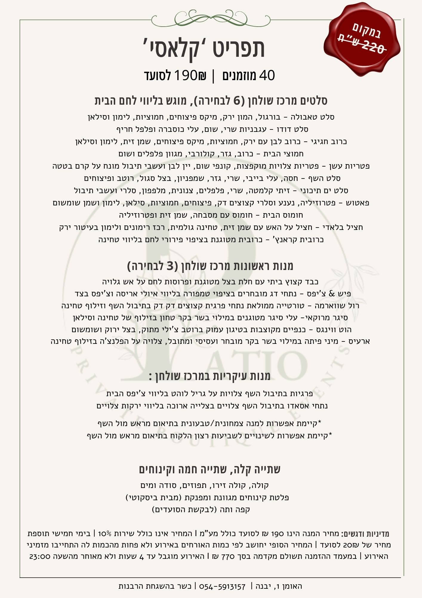 חגגנו אתמול יום הולדת 60 לחמתי. היה אירוע מהמם. המקום גדול, נוח, נקי ומעוצב יפה. האוכל טרי וטעים. בעל המקום ארתור הוא איש מקסים ונדיב. רואים שהוא אוהב את המקום ואוהב לארח. הכל היה מתוקתק, בזמן ופשוט טעים!! הוא דואג להכל בשביל האירוע. ממליצה מאוד! לא תתאכזבו.