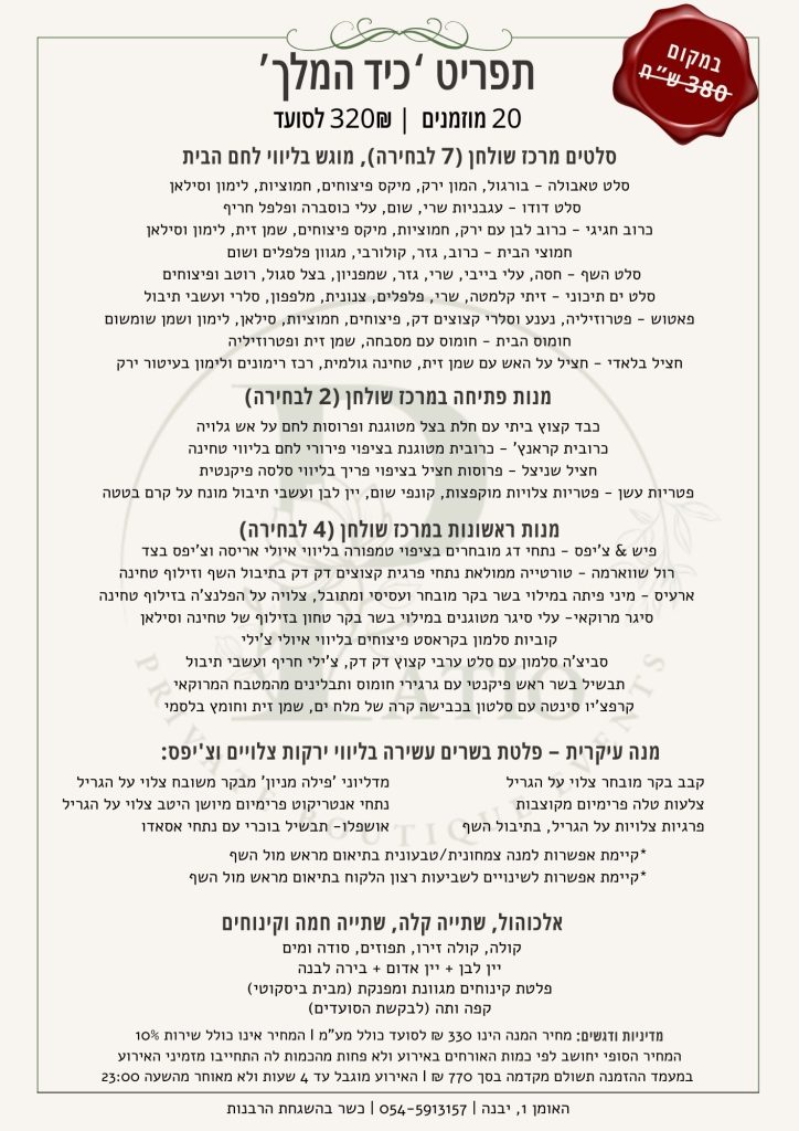לצד התפריטים הקבועים, אנו מציעים גמישות מלאה – תוכלו לבצע התאמות, לשלב מנות חדשות ואפילו להציע רעיונות משלכם. אנחנו מאמינים בשיתוף פעולה מלא בהפקת האירוע, וביחד נבנה חוויה קולינרית שתשאיר טעם של עוד!